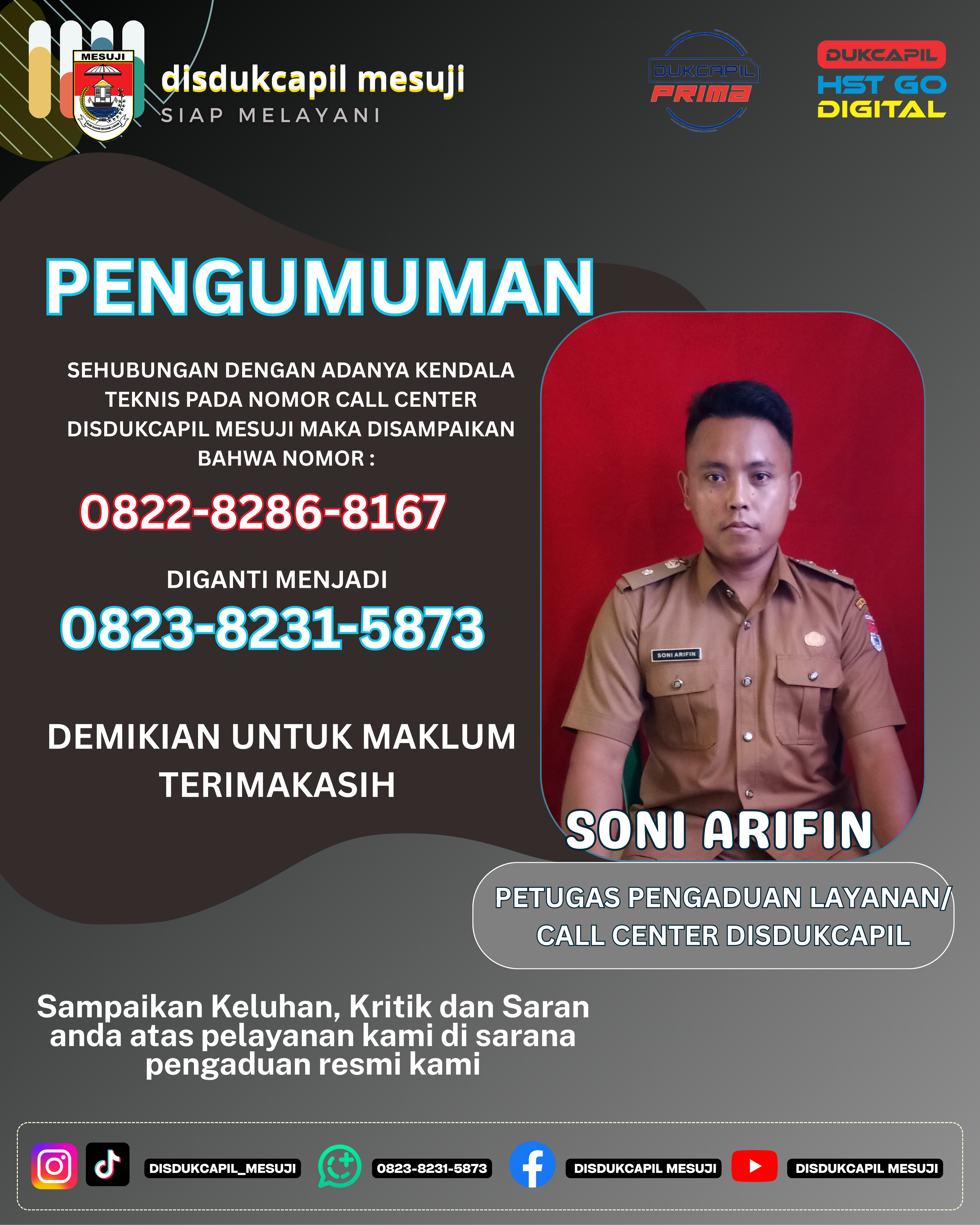 Nomor Call Center Dinas Kependudukan dan Pencatatan Sipil Kab. Mesuji diganti menjadi 0823-8231-5873