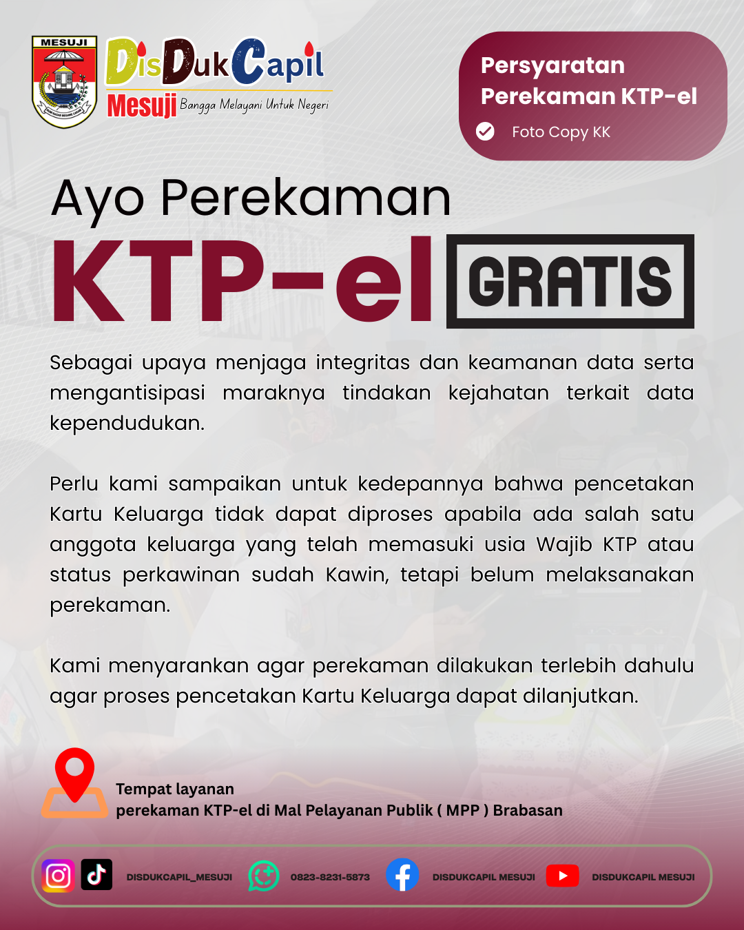 Perlu kami sampaikan untuk kedepannya bahwa pencetakan Kartu Keluarga tidak dapat diproses apabila ada salah satu anggota keluarga yang telah memasuki usia Wajib KTP atau status perkawinan sudah Kawin, tetapi belum melaksanakan perekaman.
